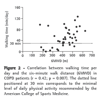 In summary, COPD patients in Brazil were less active in physical activities of daily living when compared with healthy elderly individuals, in addition to walking with lesser intensity of movement. The time of daily walking correlated only moderately with the functional capacity and the maximal capacity of exercise.