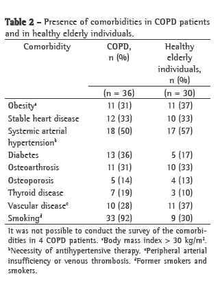 The groups were paired as for the distribution of gender and presented no statistical differences as for age and BMI. In addition to the obstruction of the airflow and the decrease of the exercise capacity shown in Table 1, the COPD patients presented a MRC scale score of 3 ± 1 points, BODE index of 4 ± 2 and smoking history of 38 ± 35 pack-years. Table 1 also shows that the healthy elderly individuals presented normal values for pulmonary function and exercise capacity.