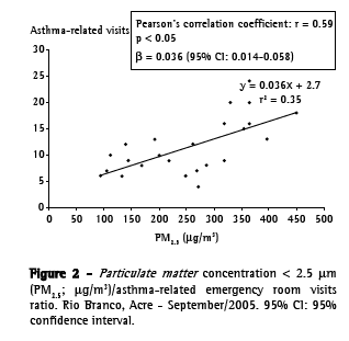 Figure 1 reveals that PMconcentrations 2.5 exceeded the air quality limit of on 23 days, with values of up to 450 μg/m3, nine times higher than the parameter established by the World Health Organization.(16) We observed a positive relationship between the seven-day sliding PM 2.5 means and the number of emergency room visits for asthma (Figure 2).