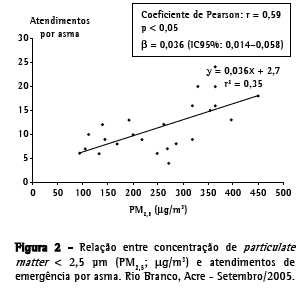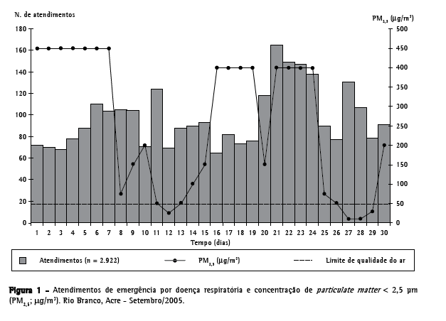 A poluição atmosférica é um importante problema de saúde pública, principalmente na Amazônia e grandes cidades brasileiras. Em setembro de 2005, observou-se elevada concentração de fumaça em Rio Branco, Acre, devido às queimadas. Para avaliar a relação entre a concentração diária de particulate matter < 2,5 μm (PM2,5) e o número de atendimentos diários de emergência por doença respiratória (DR), desenvolveu-se estudo ecológico. A concentração de PM2,5 ultrapassou o limite de qualidade do ar durante 23 dias. Observou-se maior incidência de DR em crianças < 10 anos e correlação positiva entre a concentração de PM2,5 e atendimentos por asma.