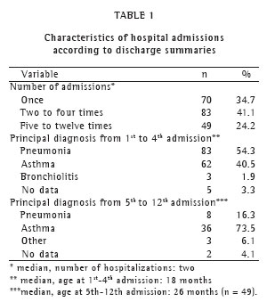 The principal risk factors for multiple hospital admissions include the following: age bracket, especially the younger than five years of age bracket;(8,11-12) the number of previous admissions;(1-2,11) low socioeconomic level;(1,8-9) and the lack of regular follow-up treatment of the disease.(2,8) However, the younger than five years of age bracket is very broad, which might mask the epidemiologic importance of suckling infants.
