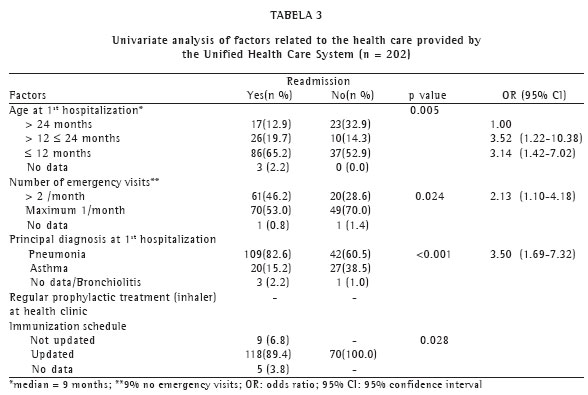 Visits to emergency rooms (Table 3) were associated with multiple admissions (OR = 2.13, 95% CI: 1.10-4.18), and 91% of the patients had visited the emergency room at least twice per month. None of the patients were submitted to regular follow-up evaluation or prophylactic treatment for asthma at any of the basic health care clinics. Noncompliance with the immunization schedule was associated with multiple admissions. In children who were diagnosed with pneumonia during their first hospitalization, the risk of multiple admissions was approximately three and a half times greater (OR = 3.50, 95% CI: 1.69-7.32).
