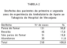 Neste estudo, comparando-se os dois primeiros anos, observou-se que, no segundo, os pacientes utilizaram menos antidepressivos isoladamente. Por outro lado, houve maior associação das duas drogas do tratamento padrão, já que se passou a dispor do adesivo de nicotina continuamente. Esta modificação contribuiu para elevar significativamente a taxa de abstinência e reduzir o índice de recaída. As chances de sucesso total e parcial foram associadas ao uso da medicação, bupropiona ou adesivo isoladamente, e não apresentaram diferença com relação ao perfil do tabagista avaliado neste protocolo.