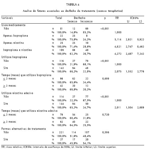 Com relação ao período da terapia medicamentosa, a bupropiona foi estendida até três meses em 65,6% dos casos e a TRN em 68,4% das vezes. O insucesso apresentou associação significativa (p < 0,001) com a não utilização de medicação, seja bupropiona (68,1%) ou adesivo de nicotina (67,5%).