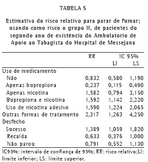 O sucesso parcial do terceiro ano foi de 56,7%. Com relação à chance de um paciente parar de fumar parcialmente, ao entrar no programa, ela foi significativa para aquele que usou antidrepressivo ou adesivo por um período médio de três meses. A recaída foi mais freqüente naqueles que utilizaram terapia complementar. Comparando-se os dois primeiros anos, observou-se que, no segundo, os pacientes utilizaram menos antidepressivo isoladamente (IC95%: 0,115 a 0,49; risco relativo de 0,237). Em contrapartida, houve maior associação das duas drogas, bupropiona e adesivo de nicotina (IC95%: 1,142 a 2,220; risco relativo de 1,592); a chance de sucesso foi significativamente maior (IC95%: 1,059 a 1,820; risco relativo de 1,389) e houve tendência à redução da recaída (IC95%: 0,376 a 1,000; risco relativo de 0,633) (Tabela 5).