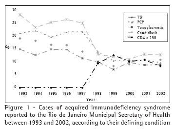 The use of highly active antiretroviral therapy (HAART) is related to a decrease in the incidence of most opportunistic infections (OIs).(1-2) In Brazil, antiretroviral medication is available for free to patients infected with the human immunodeficiency virus (HIV) or to those with acquired immunodeficiency syndrome (AIDS), according to the treatment criteria established by the Ministry of Health and adopted nationwide.(3) Since 1982, more than 28,000 AIDS cases have been reported to the Rio de Janeiro Municipal Epidemiological Surveillance System.(4) Since 1992, zidovudine has been available to the public health network and, since 1994, other nucleoside analog reverse transcriptase inhibitors have also been available. At the end of 1996, protease inhibitors were added to the antiretroviral therapy arsenal, which had a significant impact on the life expectancy of patients with HIV/AIDS.(5-6) At the beginning of 2004, approximately 22,000 individuals were receiving antiretroviral therapy at the 54 public health facilities in the city of Rio de Janeiro.