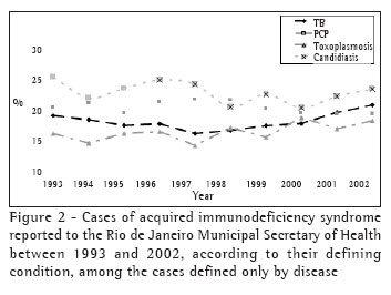 Objetivo: Analisar a freqüência da tuberculose e das outras principais doenças oportunistas definidoras de síndrome da imunodeficiência adquirida, no momento em que estes casos são notificados, no Município do Rio de Janeiro. Métodos: Análise do banco de dados do Sistema de Vigilância Epidemiológica do Programa de Doenças Sexualmente Transmissíveis e Síndrome da Imunodeficiência Adquirida da Cidade do Rio de Janeiro, no período de 1993 a 2002. Resultados: A expansão da definição de casos de síndrome da imunodeficiência adquirida ocorrida em 1998 criou um aumento substancial no número de casos notificados de síndrome da imunodeficiência adquirida, principalmente por aqueles que passaram a ser definidos pelo critério imunológico. Dentre os casos de síndrome da imunodeficiência adquirida que foram definidos apenas por doença, a candidíase em suas diversas formas manteve-se como a doença oportunista de maior freqüência no momento da notificação. Embora a pneumonia por Pneumocystis carinii se apresentasse como a segunda doença mais freqüente na maioria dos anos observados, a partir de 2001, a tuberculose ultrapassou-a em freqüência, tornando-se a segunda doença mais freqüente no momento da notificação dos casos de síndrome da imunodeficiência adquirida. Conclusão: Apesar da diminuição do número de casos de síndrome da imunodeficiência adquirida definidos por doença, a tuberculose manteve-se como um importante evento definidor dessa síndrome, sendo atualmente de ocorrência mais freqüente do que a pneumonia por Pneumocystis carinii e a toxoplasmose, provavelmente por sua alta taxa de prevalência na cidade.