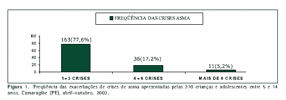 Na Figura 1 observa-se que 163/210 crianças e adolescentes apresentaram de uma a três crises de asma no ano de 2001 (77,6%), enquanto que 47/210 apresentaram mais de quatro crises (22,4%).