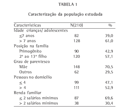 Na Tabela 1 apresentam-se as características da população estudada. Nela, verifica-se que 128 crianças encontravam-se com mais de 7 anos (61%), 90 eram primogênitas (42,9%), e 148 das pessoas entrevistadas foram a própria mãe (70,5%). Observou-se que em 111 domicílios havia mais de quatro pessoas (52,9%) e em 87 deles a renda familiar era menor que dois salários mínimos (69,6%).