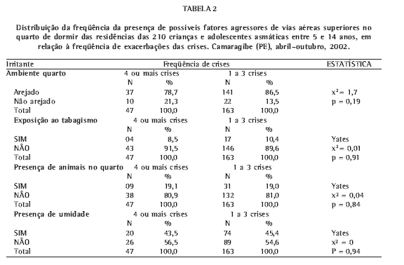 Na Tabela 2 apresenta-se a associação existente entre presença de irritantes no quarto de dormir das crianças e adolescentes e freqüência de crises de asma. Observa-se que, no grupo de quatro ou mais crises de asma, o ambiente era arejado em 37/47 casos (78,7%), havia umidade em 20/47 quartos estudados (43,5%), ocorria exposição ao fumo em 04/47 (8,5%) e encontravam-se animais no dormitório em 09/47 casos (19,1%). Em relação ao grupo que apresentou de uma a três crises, encontrou-se ambiente arejado em 141/163 casos (86,5%), umidade em 74/163 (45,4%), presença de animais em 31/163 (19%) e exposição ao fumo em 17/163 deles(10,4%), não havendo diferença significativa entre os grupos.