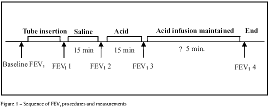The study consisted of spirometry performed before and after the following procedures: insertion of the esophageal tubes (manometry, pH monitoring and an 8F nasogastric tube); esophageal infusion of normal saline solution (pH 5.5 to 6.0) at 10 to 20 microdrops/min for 15 minutes; and infusion with hydrochloric acid (HCl) 0.1N (pH 1.0 to 1.5), using the same drip rate and duration. These solutions were infused through the 8F intranasal tube into the midpoint between the upper esophageal sphincter and lower esophageal sphincter, previously defined through esophageal manometry. After the initial 15 minutes of esophageal acidification, new spirometry measurements were taken every 5 minutes until FEV1 values stabilized (variation: < 5%), thus ending the protocol. Throughout all the procedures, proximal and distal esophageal pH was monitored through the pH monitoring system. The spirometric tests were carried out in the Pulmonary Function Testing Laboratory of the Pulmonology Department of the Faculdade de Medicina de Ribeirão Preto of the University of São Paulo and were all performed in the morning, using the same equipment, and by the same certified professional technician. The schematic