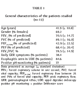 Keywords: Key words: Asthma. Gastroesophageal reflux. Respiratory function tests. Endoscopy/methods.