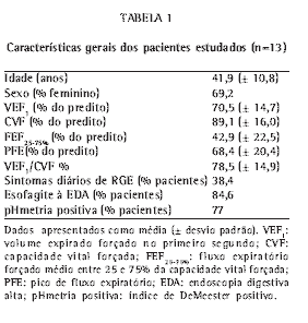 Todos os treze indivíduos que foram submetidos ao protocolo de estudo realizaram os testes sem dificuldades ou intercorrências, com exceção do caso número 7. Este paciente apresentou broncoespasmo grave após 15 minutos de infusão de HCl no esôfago, não conseguindo, por este motivo, realizar os testes de função pulmonar, denominados, neste artigo, de HCl e HCl estabilidade. Os dados deste caso foram usados parcialmente na análise e demonstração dos resultados. As características gerais dos pacientes, função pulmonar e características da doença do RGE estão demonstradas na Tabela 1. Todos os pacientes apresentavam asma moderada (critério clínico, VEF1 ou PFE) durante a seleção. Porém, no momento do exame, dois casos que tinham critérios para asma moderada apresentaram valores de VEF1 inferiores a 60%, sem sinais de exacerbação aguda do quadro clínico. Decidimos continuar o protocolo devido à estabilidade do quadro clínico, vontade e consentimento desses pacientes.
