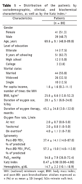 No significant gender predominance was found. Most of the patients were married, had a mean age of 69.6 years, and had a low level of education. Most of the patients were hypoxemic, with reduced lung capacity, and had to remain connected to the source of oxygen for long periods. The patients had a low degree of dependence in ADL, as determined by the Katz index (mean, 0.47 ± 0.98).