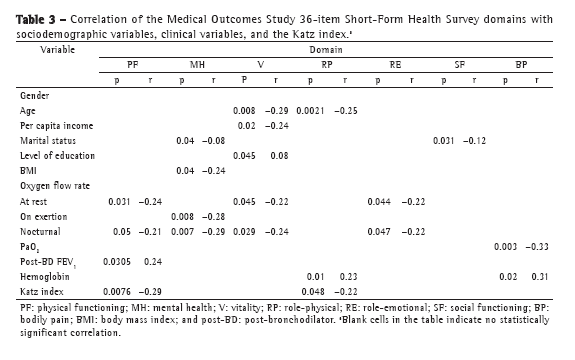 Anemia, in addition to being a predictor of mortality in COPD patients on LTOT, can contribute to increasing dyspnea and cause exercise limitation. In the present study, serum levels of hemoglobin were found to correlate positively with the role-physical and bodily pain domains (r = 0.23; p = 0.01 and r = 0.31; p = 0.02, respectively). We found only one study (conducted in the USA) in which the hemoglobin levels of COPD patients correlated positively with the physical components of the SF-36 (r2 = 0.0850; p = 0.003).(27) A study conducted in Brazil and involving renal failure patients on hemodialysis also showed that decreased hemoglobin levels correlated with pain (r = 0.22; p = 0.018),(28) suggesting that, regardless of the type of disease, low hemoglobin levels can increase the levels of bodily pain.