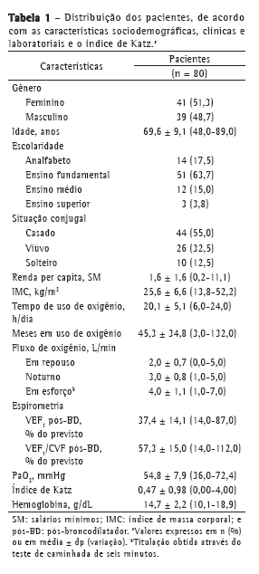 Não houve predominância significante de gênero entre os pacientes. A maioria era casada, com média de idade de 69,6 anos e baixo nível escolar. A maioria era hipoxêmica, com capacidade pulmonar reduzida, e necessitava permanecer ligada à fonte de oxigênio por longos períodos. Os pacientes apresentavam baixo nível de dependência para as AVD, segundo o índice de Katz (média, 0,47 ± 0,98).