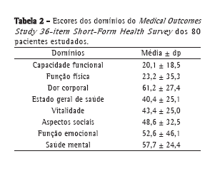 Os escores médios e desvios-padrão dos domínios do SF-36 estão apresentados na Tabela 2. Os domínios com os menores valores foram capacidade funcional e função física. Os domínios função emocional, saúde mental e dor corporal apresentaram pontuações maiores que 50.