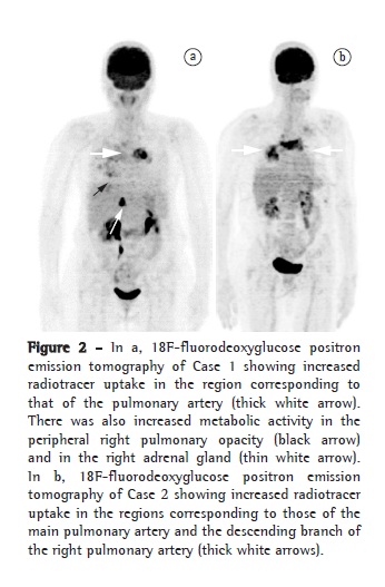 Previous reports in the literature underscore the importance of FDG-PET, especially when combined with CT, as a noninvasive method for the diagnosis and staging of many types of neoplasms. In the two cases reported here, there was positive radiotracer uptake in the same regions as those corresponding to the filling defects seen on CT angiography.(9-13) Since PET is based on an assessment of tumor metabolic activity, it has high sensitivity and high negative predictive value for assessing lung neoplasms.(14,15) Because of the difficulty in performing surgical biopsy in some cases, together with the risks of the procedure, especially in patients with pulmonary hypertension, we emphasize the importance of FDG-PET as a noninvasive tool for the diagnosis of suspected cases of vascular neoplasms of the lung.