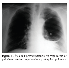 O paciente foi admitido em um serviço de pronto-atendimento com quadro de dor torácica de forte intensidade associada à dispneia de início súbito durante uma viagem aérea. O eletrocardiograma e a dosagem de enzimas cardíacas realizadas imediatamente após sua chegada foram normais. A radiografia de tórax demonstrou uma área de hipertransparência arredondada, em terço médio do pulmão esquerdo, comprimindo o parênquima pulmonar (Figura 1). A TC axial de tórax confirmou a presença da área de hipertransparência ocupando todo o segmento anterior do lobo superior esquerdo, medindo 12,2 × 9,0 cm, contendo uma fina camada líquida em seu interior. Não foram identificadas outras alterações. O paciente foi submetido à toracotomia esquerda, com intubação seletiva do pulmão, sendo encontrada uma bolha pulmonar, localizada no lobo superior, ocupando toda a face mediastinal do pulmão. Foi realizada ressecção e sutura com grampeador mecânico de toda a área comprometida e pleurodese abrasiva. Não foi observada nenhuma outra alteração macroscópica durante o ato operatório. Após o término da cirurgia, o paciente foi transferido para a UTI, acordado e extubado. Evoluiu bem no pós-operatório, com a retirada do dreno pleural no quinto dia. A radiografia de tórax de controle mostrou pulmão esquerdo reexpandido, com áreas de hipotransparência em seu terço médio, as quais foram atribuídas ao edema e ao hematoma no local da sutura. O exame histopatológico da peça cirúrgica foi compatível com malformação adenomatoide cística.