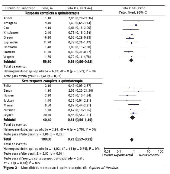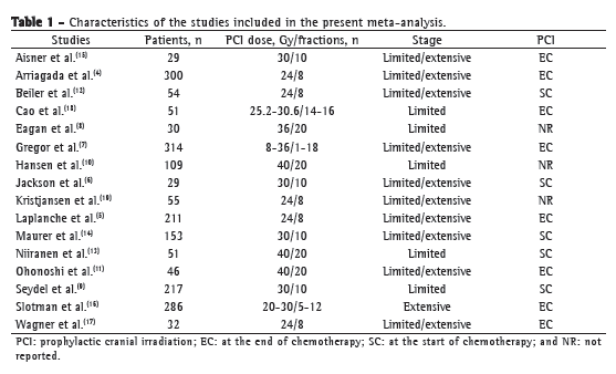 Lung cancer is the leading cause of cancer death in the USA, accounting for approximately 31% and 26% of all cancer deaths in men and women, respectively.(1) In Brazil, the estimate for the year 2010 was that 27,630 people (17,800 men and 9,830 women) would be affected.(2) In clinical practice, lung carcinomas are classified as small cell lung cancer (SCLC) and non-small cell lung cancer, the former accounting for 13-20% of all lung cancers and being strongly related to smoking.(3) Regarding the treatment of SCLC, the results are poor. Cisplatin-based chemotherapy regimens remain the best treatment for extensive SCLC, increasing survival without a significant increase in toxicity.(3) However, despite the high rate of initial response to chemotherapy (60-70% of patients with extensive disease responding to chemotherapy), mean survival is approximately 10 months.(3) This is due to the fact that, despite high response rates, recurrences and metastases are common. In 50-60% of the patients who achieve complete remission, brain metastases occur two years later. In 20-30% of those patients, the brain is the only apparent site of relapse. On the basis of the abovementioned data, several randomized clinical trials (RCTs) have investigated the role of prophylactic cranial irradiation (PCI) in patients with extensive or limited SCLC.(4-19) A meta-analysis published in 1999 and including 7 RCTs involving 987 patients with SCLC and complete response to chemotherapy showed a 5.4% increase in the three-year survival of those undergoing PCI.(20) However, ever since that meta-analysis was published, several RCTs have been published, and uncertainties still remain regarding the indications for PCI use in patients with extensive disease and in those with limited disease and an incomplete response to chemotherapy. In addition, there are uncertainties regarding the best PCI dose and treatment-related toxicity. Therefore, the primary objective of our meta-analysis was to evaluate the role of PCI in the mortality of patients with SCLC, our secondary objective being to analyze the impact of chemotherapy response, disease extent, and PCI dose on mortality in those patients.