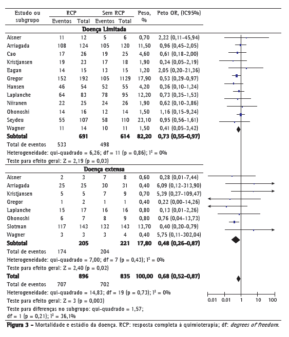 The analysis of the data collected was performed with the Review Manager software, version 5.0 (RevMan 5; Cochrane Collaboration, Oxford, UK). All analyses were based on the intent-to-treat principle, meaning that we employed a method whereby all of the patients assigned to a treatment group were included in the statistical analysis according to the randomization, regardless of whether they actually received treatment or were excluded from the analysis by the investigators. For categorical variables, we calculated the relative risk estimates and respective 95% CIs using the RevMan 5 software, in accordance with the Peto method,(21) which is a fixed effect model. The results were tested for heterogeneity and were considered significant for a p value < 0.05, in accordance with the random effects model developed by DerSimonian & Laird.(22) We used the fixed effect model when there was no evidence of heterogeneity among the studies; otherwise, we used the random effects model. For each RCT, we calculated the OR and 95% CI, which are presented as forest plots. When possible, the analyses were performed separately for each group, namely the PCI group and the control group in each of the two arms. The subgroup analyses for each outcome were performed by recalculating the ORs and 95% CIs for each of the following comparisons: between response to chemotherapy and no response to chemotherapy; between limited and extensive disease; and among the various intervals between chemotherapy and initiation of PCI. We assessed the heterogeneity across studies using the I2 statistic. The I2 statistic describes the proportion of total variation across studies due to heterogeneity rather than chance. The interpretation of I2 depends on the magnitude and direction of the effects, as well as on the strength of evidence for heterogeneity (i.e., the p value for the chi-square test or the 95% CI for I2). In order to detect publication bias, we used funnel plots, thereby an asymmetry in the graph represents the presence of bias, mainly due to the presence of studies with small samples (which are biased in that they show high ORs) but also due to the fact that such studies do not show significant results and are therefore less likely to be published.