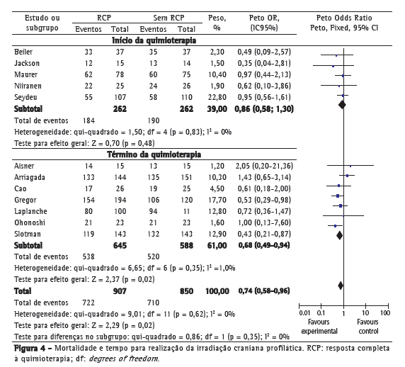 Mortalidade e a resposta à quimioterapiaUma análise de subgrupo foi realizada para se avaliar o impacto da resposta à quimioterapia sobre a mortalidade. Desse modo, os resultados foram estratificados de acordo com a avaliação da resposta a quimioterapia, gerando dois grupos: aquele com resposta completa à quimioterapia e aquele sem resposta à quimioterapia. A análise de subgrupos identificou que os pacientes com resposta à quimioterapia (1.320 pacientes em 9 estudos) se beneficiaram do uso da ICP (OR = 0,68; IC95%: 0,50-0,93; p = 0,02), com uma redução absoluta na mortalidade de 5%, ou seja, para cada 20 pacientes tratados, evita-se uma morte (Figura 2). Por outro lado, não houve qualquer benefício da ICP para os pacientes sem resposta a quimioterapia (663 pacientes em 7 estudos; OR = 0,81; IC95%: 0,56-1,19; p = 0,29). Não houve heterogeneidade através dos estudos (p = 0,57), demonstrando que os resultados são válidos.