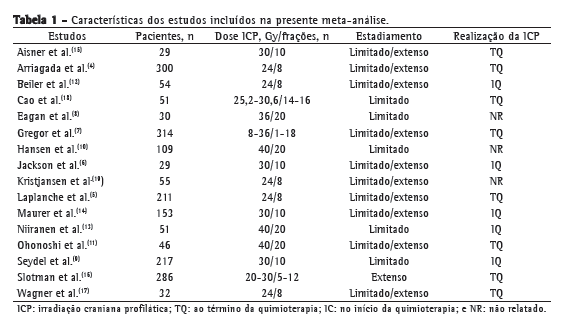 ResultadosUm total de 16 ECRs,(4-19) publicados entre 1977 e 2007, foram considerados elegíveis para a inclusão no presente estudo. Suas principais características estão resumidas na Tabela 1. O número total de pacientes elegíveis incluídos foi de 1.983, com 1.021 pacientes randomizados para o grupo ICP e 962 pacientes para o grupo controle. Em 7 estudos (894 pacientes),(4,5,7,11,15) foi avaliado o papel da ICP em pacientes que tiveram uma resposta completa após a quimioterapia de indução. Em 5 estudos,(6,9,12-14) foi avaliado o papel da ICP administrada no início da quimioterapia de indução em pacientes considerados como livres de metástases cerebrais. Em 7 estudos (894 pacientes),(4,5,7,11,15) foi avaliado o papel da ICP em pacientes que a receberam durante a quimioterapia de indução. Em 2 estudos,(6,8) a ICP foi dada como tratamento de consolidação no final da quimioterapia, antes da avaliação da resposta. Em 10 estudos,(4-6,11,12,14,15) foram incluídos pacientes independentemente do estadiamento da doença (local ou extensa).(6-9,13) Por outro lado, em 6 estudos, foram incluídos somente pacientes com doença limitada, enquanto, em apenas 1 estudo, foram incluídos somente aqueles com doença extensa.(16)