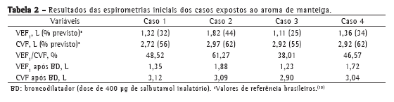 As bronquiolites em adultos têm etiologia variada, incluindo infecções virais, tabagismo, inalação de substâncias tóxicas, rejeição crônica em transplantes de pulmão e de medula óssea, doenças do colágeno e formas idiopáticas.(1) Tendo em vista suas características clínicas e espirométricas, é frequentemente confundida com doenças mais comuns, sobretudo a asma e a DPOC. Sua evolução clínica é variável, mas comumente observa-se progressão para doença obstrutiva grave e incapacitante. Nos últimos anos, tem sido descrita uma grave forma de bronquiolite causada pela inalação de aromatizantes em trabalhadores de fábricas de alimentos, sobretudo de pipoca de microondas (daí a designação "pulmão da pipoca"), principalmente nos EUA, mas também na Europa.(2-7) O objetivo do presente estudo foi descrever os achados clínicos, espirométricos e tomográficos em quatro jovens com exposição ao aroma artificial de manteiga numa fábrica de biscoitos no Brasil. Os achados da biópsia pulmonar, realizada em um paciente, são relatados.
