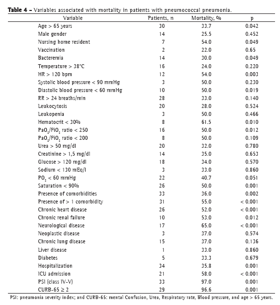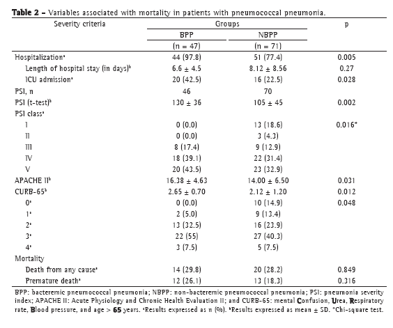 Of the 118 patients, 34 (28.6%) died of pneumococcal pneumonia. Among those patients, being over 65 years of age, being a nursing home resident, having tachycardia and hypotension at admission, having a hematocrit level < 30%, and having a PaO2/FiO2 < 250 or oxygen saturation < 90% constituted variables that were significantly associated with higher mortality. The presence of chronic renal failure, chronic heart failure, or neurological disease was associated with higher mortality, as was the presence of more than one comorbidity. Other variables associated with a poor prognosis included ICU admission, CURB-65 ≥ 2, and PSI class IV-V. However, when analyzing those characteristics in terms of the presence or absence of bacteremia, we found no statistically significant differences between the two groups (Table 4).