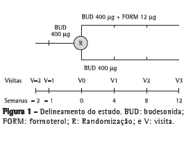 O estudo consistiu em seis visitas consecutivas, realizadas no período da manhã (Figura 1). Na primeira visita (V-2), os pacientes elegíveis para o estudo receberam e assinaram o consentimento informado, realizaram espirometria e receberam orientações sobre o estudo. Na semana seguinte (V-1), os participantes retornaram para receber a medicação de uniformização (budesonida 400 µg, duas vezes ao dia por 4 semanas); na visita subsequente (V0), os pacientes foram randomizados para uma das medicações do estudo. As visitas V1, V2 e V3 foram realizadas a cada 4 semanas. Os resultados da espirometria na V0 foram considerados como basais. A primeira espirometria foi realizada até as 10 h da manhã, e as próximas obedeceram a uma janela de ± 2 h em relação à hora da primeira espirometria, não ultrapassando as 11 h da manhã. Coletas de sangue para a avaliação da segurança foram realizadas nas V-2, V0 e V3. Sintomas, uso de medicação de resgate e medidas diárias de PFE com o dispositivo mini-Wright® (Clement Clarke International, Essex, Inglaterra) antes da utilização dos medicamentos do estudo foram registrados pelos participantes em um diário.