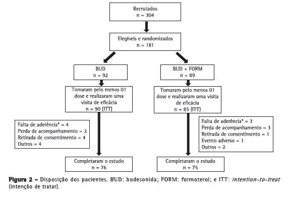 Entre abril de 2009 e junho de 2010, 304 asmáticos adultos foram recrutados em quatro centros de pesquisas brasileiros. Desses, 181 foram incluídos e randomizados para uma das intervenções do estudo; 175 participantes utilizaram pelo menos uma dose do medicamento (90 no grupo budesonida e 85 no grupo budesonida+formoterol [BF]), tendo sido considerados na análise por intenção de tratamento (Figura 2). As características demográficas e os parâmetros espirométricos basais estão resumidos na Tabela 1 e foram semelhantes entre os grupos de tratamento.