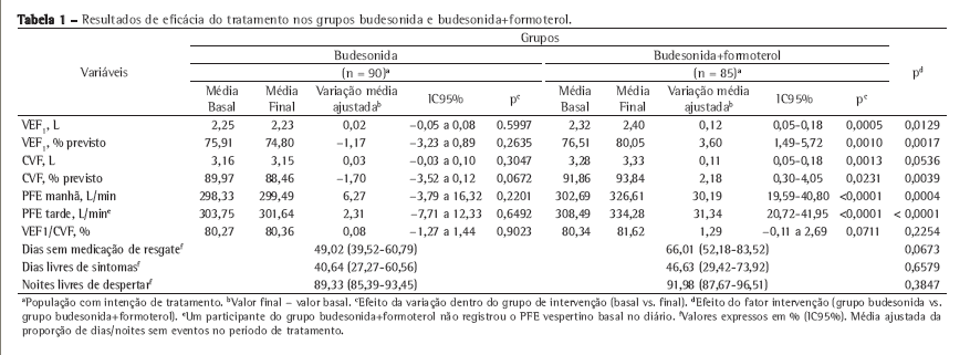 Com relação aos desfechos primários, o tratamento de 12 semanas no grupo BF, quando comparado com grupo budesonida, resultou em um aumento médio, estatisticamente significante, do VEF1 e do PFE matutino de 104 mL (IC95%: 22-186 mL) e de 23,93 L/min (IC95%: 10,89-36,93 L/min), respectivamente. Esses resultados representam uma estimativa da diferença da variação (final − basal) do VEF1 na comparação dos dois grupos, calculada com a seguinte equação: