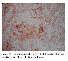 Hematoxylin and eosin staining of the sample revealed fusocellular neoplasia. In attempting to determine its lineage, it was not possible to distinguish between fibrous histiocytoid cells and smooth muscular cells. Therefore, immunohistochemical studies were ordered. The results revealed an inflammatory pseudotumor of the fibrous histiocytic type (CD 68 markers and XIII factor, specific for fibrous histiocytic cells, were positive - Figure 3).