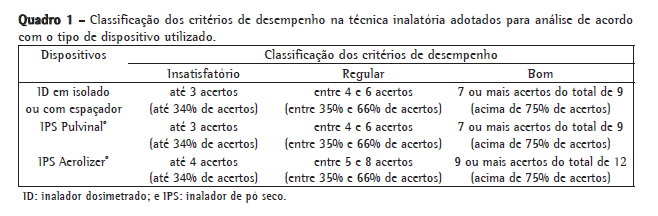 As diferentes etapas para utilização dos dispositivos foram avaliadas de acordo com as técnicas listadas nas bulas dos medicamentos e com a prática clínica, considerando o total de acertos e a lista de verificação adaptada de Muniz et al.(11) Algumas etapas são consideradas essenciais para o uso adequado dos diferentes dispositivos e foram revisadas por vários autores.(12-14,17,18) No presente estudo, foram adotados alguns dos critérios estabelecidos por esses autores para o uso de ID e IPS.
