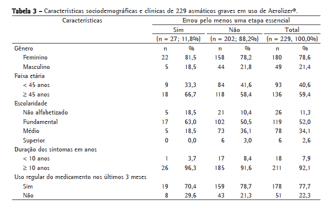 A realização adequada das etapas essenciais para o uso dos dispositivos foi um dos fatores influenciadores no controle dos sintomas da asma. Essas etapas estão relacionadas ao local correto para colocar a cápsula, a perfuração dessa para a posterior liberação do medicamento e a inspiração rápida e profunda. A efetivação da inspiração rápida e profunda é fundamental para o transporte completo do fármaco para o pulmão, sendo essa a etapa com maior proporção de erros dentre as essenciais no presente estudo. Esse fato pode ter contribuído para a falta de controle da asma entre aqueles que não a executaram corretamente, corroborando os achados de um grupo de autores,(18) que relataram que a inalação lenta é uma das razões para a distribuição parcial do fármaco no pulmão. Não foram observadas diferenças significativas quanto às características clínicas e sociodemográficas entre os subgrupos em uso apenas do IPS Aerolizer®. Entretanto, observou-se que os asmáticos graves que cometeram erros essenciais apresentavam menor escolaridade e idade superior a 45 anos. Esses resultados foram evidenciados em outro estudo que mostrou uma maior taxa de erro no uso dos IPS entre os indivíduos com idade mais avançada e com baixo nível educacional.(17)