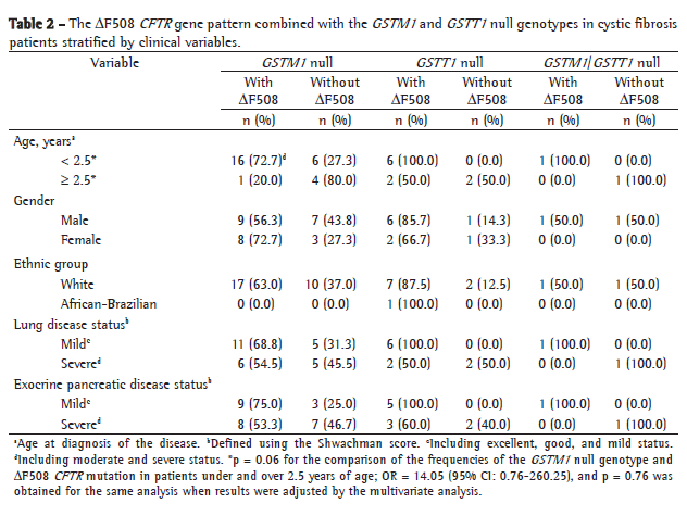 DiscussionThe distribution of the patients enrolled in the study by age at diagnosis, gender, ethnic origin, and severity of lung/exocrine pancreatic disease status showed that our CF patients were similar to those in other countries.(1) The F508 CFTR gene mutation was the most common mutation found in our study, which corroborates other reports from the same region of Brazil,(16,22-25) as well as international reports.(26,27) Other mutations of the CFTR gene, such as R1162X and N1303K, were less common in our CF patients,(22,24,28) as has been reported for CF patients in other parts of the world.(27) The frequencies of the GSTM1 and GSTT1 null genotypes in the CF patients in our study were similar to those found in healthy individuals, in Brazil(29) and elsewhere.(15) Therefore, our sample seems to be representative of CF patients throughout the world.