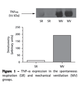 It is widely known that TNF- is an early inflammatory cytokine that subsequently regulates early neutrophil infiltration and eosinophil recruitment into the lung and airspace, produced by other inflammatory cells, such as macrophages, or via mechanotransduction mechanisms.(19) In previous studies, it has been reported that TNF- levels were unchanged following 2 h of MV.(20) In view of the fact that TNF- expression was significantly increased in the lung homogenates of the MV group, we believe that short-term MV with a low VT was able to initiate the inflammatory response in the mouse lungs. The elevated protein content in BALF and the increase in myeloperoxidase activity(21) might support this statement regarding our MV group. We believe that the use of a distinct mouse strain might account for these differences, since we have shown, in a previous study, that C57BL/6 mice are more susceptible to oxidative damage than are Swiss mice.(4)