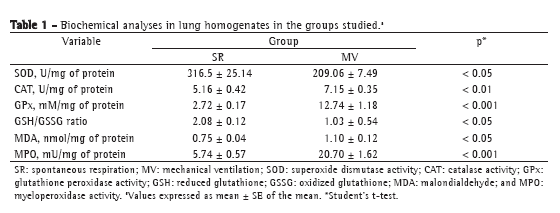 It has been previously reported that MV is a modulator of oxidative stress not only in the lungs,(22) but also in other organs,(23) and that nuclear factor (erythroid-derived-2)-related factor-2 (NRF-2), which is a signal-activated transcription factor for antioxidant enzymes, plays a critical role in that stress.(24) We believe that, in the present study, two main processes were involved in the lung injury caused by MV: oxidative stress and inflammation. It is known that MV increases neutrophil recruitment and myeloperoxidase activity in animals and humans.(25) Myeloperoxidase is mainly released by activated neutrophils, and this is also characterized by powerful pro-oxidative and pro-inflammatory properties. In addition, myeloperoxidase catalyzes the production of potent oxidants, such as hypochlorous acid, and of the nitrating species (such as nitrogen dioxide from nitrite).(26) Therefore, oxidative damage is most likely to occur in an environment where myeloperoxidase activity is high.