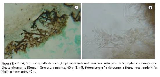 O empiema diagnosticado pela presença de líquido purulento na cavidade pleural terá sua etiologia fúngica estabelecida pelos seguintes critérios: isolamento do fungo no exsudato; sinais importantes de infecção, como febre (temperatura corporal > 38°C) e leucocitose (> 10.000 células/µL); e isolamento do mesmo agente no espécime pleural em mais de uma ocasião, ou também em sangue, escarro ou feridas cirúrgicas que demonstrem invasão tecidual.(21,23) A invasão na cavidade pleural por Aspergillus sp. é incomum e é geralmente decorrente de uma complicação tardia, empiema crônico tratado por pleurostomia ou pneumotórax, empiema esse associado a fístula broncopleural, tuberculose pulmonar prévia, cavernostomia ou complicação de aspergilose invasiva.(11,20)