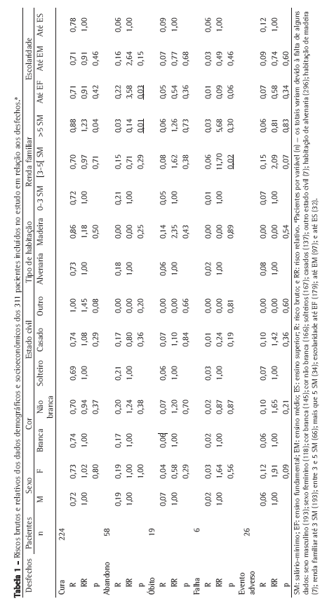 A taxa de falha terapêutica foi de 1,9%. À semelhança do óbito, não foi possível proceder com a análise para a estimativa de medidas ajustadas dos preditores. Apenas a baixa renda indicou ser um potencial preditor de falha terapêutica.