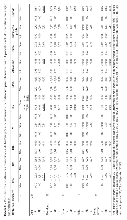 DiscussãoNesta coorte de 311 pacientes acompanhados por dois anos após o desfecho do tratamento da tuberculose, encontramos elevadas taxas de óbito e de abandono, que comprometeram a taxa de cura. Esses dados contrastam com os dados do Sistema de Informação de Agravos de Notificação de 2004,(8) que relatou uma taxa de cura de 70,4%, e essa foi comprometida muito mais pelo abandono do que pela mortalidade, que atingiu a taxa de 3,7%. Esses achados possivelmente se explicam pela elevada proporção de pessoas vivendo com HIV/AIDS em nossa casuística.