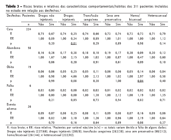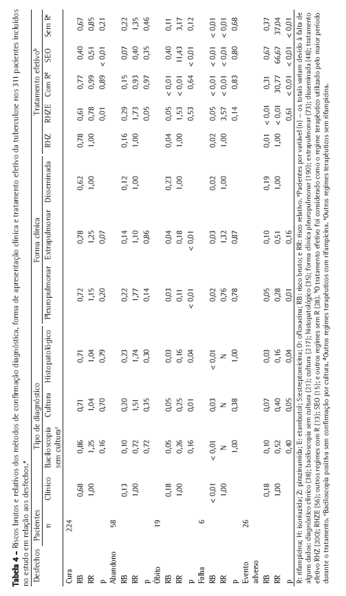 Houve necessidade de troca de regime por efeito adverso em 26 pacientes (8,4%), e essa foi a principal justificativa de interrupção do tratamento. As queixas mais frequentes de efeitos adversos foram toxicidade hepática, em 5,8%; e rash cutâneo e prurido, em 1,9%. A resistência bacteriana justificou a troca de regime terapêutico em 4,5% dos casos, sendo que 2,3% dos pacientes apresentaram resistência isolada à isoniazida, 1,0% apresentou resistência isolada à rifampicina, e 1,3% apresentou formas multirresistentes. Em relação aos preditores de necessidade de troca de regime por efeito adverso, destacam-se a forma clínica disseminada (RR = 3,56); infecção por HIV com TARV (RR = 2,46); diagnóstico confirmado bacteriologicamente (RR = 0,40) ou diagnóstico confirmado por exame histopatológico (RR = 0,16).