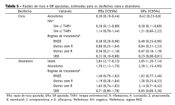A taxa de cura foi de 72,0%. Entre os 224 casos considerados curados, ocorreram 7 recidivas, das quais 6 no primeiro semestre e 1 no segundo. Os riscos brutos e RR dos preditores de cura estão apresentados nas Tabelas 1 a 4. No modelo final, quatro variáveis reduziram a probabilidade de cura: alcoolismo (RRa = 0,30), uso do regime SEO (RRa = 0,32), infecção por HIV sem TARV (RRa = 0,36), e uso do regime RHZ+etambutol (RRa = 0,58). A faixa etária mais jovem (RRa = 3,85) - o abandono incrementa à medida que a idade diminui - e o alcoolismo (RRa = 1,76) aumentaram a probabilidade do abandono (Tabela 5).