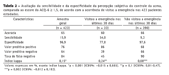 A concordância pela análise do coeficiente kappa (0,15) foi muito baixa entre a percepção subjetiva do paciente e o escore do ACQ-6. Um kappa (0,24) mais elevado, embora estatisticamente não significativo, foi encontrado entre os pacientes que visitaram a emergência no mês anterior.