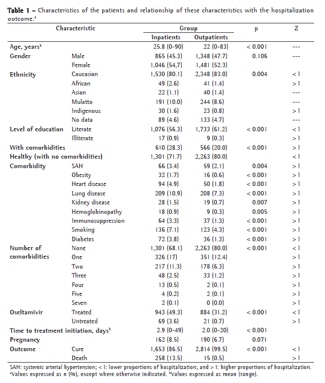 To study the factors that showed a relationship with hospitalization, we included the following variables: age; ethnicity; level of education; comorbidities; major signs and symptoms; outcomes (cure and death); treatment with oseltamivir; date of symptom onset; date of hospitalization; time to treatment initiation after symptom onset; chest X-ray findings; and influenza vaccination. Individuals who selected "yes" in the "influenza vaccination" field were considered vaccinated, regardless of the date of vaccination. Major symptoms were defined as those addressed on the report form, recorded as "yes" or "no" separately, and as those entered by the patient ("others" field) and showing a significant relationship with the hospitalization outcome among the patients included in the study.