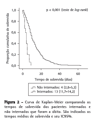 A Figura 2 ilustra a curva de Kaplan-Meier comparando os tempos de sobrevida dos pacientes internados e daqueles não internados que foram a óbito. São indicados os tempos médios de sobrevida e seu IC95%.