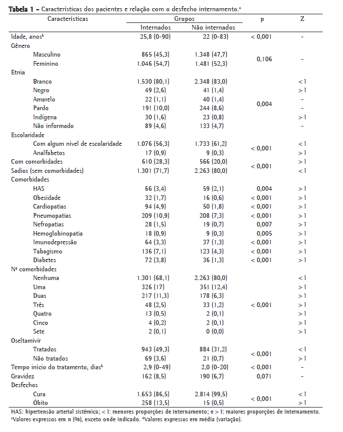 Os fatores de risco para o internamento foram idade, presença de algumas comorbidades (cardiopatias, pneumopatias, nefropatias, hemoglobinopatia, imunodepressão, diabetes, obesidade, puerpério e tabagismo), número de comorbidades associadas, presença de alguns sintomas (dispneia, vômito, dor torácica, hemoptise e sibilos) e de algumas manifestações clínicas (diarreia e pneumonia). Níveis maiores de escolaridade e uso precoce do oseltamivir foram relacionados a fatores de proteção. A hospitalização dos pacientes contribuiu para o aumento da sobrevida, e a vacinação contra a influenza pareceu diminuir a gravidade clínica da infecção por essa cepa pandêmica, refletindo em menores taxas de internamento e de óbito.