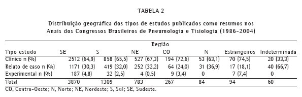 No período do estudo, os dez Congressos Brasileiros de Pneumologia foram realizados, em anos alternados, de 1986 a 2004, em Recife (PE), Curitiba (PR), Salvador (BA), Brasília (DF), Natal (RN), Belo Horizonte (MG), Rio de Janeiro (RJ), Gramado (RS), São Paulo (SP) e Salvador (BA), tendo sido publicado o total de 6.467 resumos. Destes, 6.373 eram oriundos de instituições brasileiras (98,5%), sendo 5.825 de instituições públicas (90%), 495 de instituições privadas (7,8%) e 53 de origem indeterminada (0,8%). Instituições estrangeiras foram a origem de 94 resumos (1,5%). Os países estrangeiros originários destas instituições foram: Portugal (53 resumos), EUA (13), Espanha (10), México (4), Angola, Canadá e Itália (3 resumos cada) e Argentina, Equador, França e Suíça (1 resumo cada).