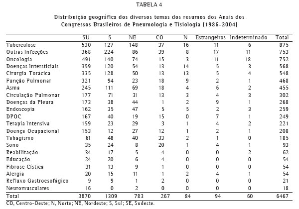 Na Tabela 4 são mostrados os números de resumos sobre cada tema apresentado por cada uma das regiões do país, do exterior e de origem indeterminada. Observa-se que os resumos provenientes da Região Sudeste são em maior número em todos os 21 temas discriminados e que tuberculose e outras infecções são os temas mais prevalentes em todas as regiões do Brasil e nos estudos estrangeiros.