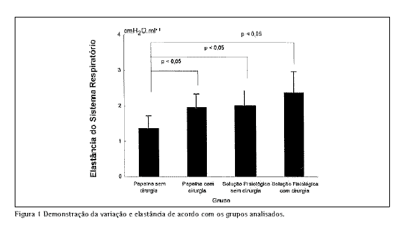Realizando-se o teste não-paramétrico de Kruskall-Wallis, encontramos o seguinte resultado para a resistência do sistema respiratório: no grupo controle A (solução fisiológica sem cirurgia), grupo controle B (solução fisiológica com cirurgia), grupo estudo 1 (solução de papaína com cirurgia) e grupo estudo 2 (solução de papaína sem cirurgia) não houve diferenças estatisticamente significativas (p < 0,05); com relação à elastância do sistema respiratório, verificou-se que os grupos diferiram entre si (p = 0,001) (Figura 1).